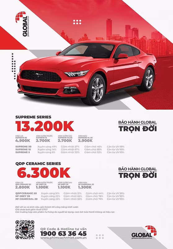 Global cung cấp đa dạng mã phim cách nhiệt dành cho ô tô, từ phim men gốm, phim không phản gương đến phim tráng phủ kim loại, tất cả đều đi kèm với chế độ bảo hành trọn đời. Điều này mang lại cho người dùng sự thoải mái và yên tâm khi chọn lựa sản phẩm.